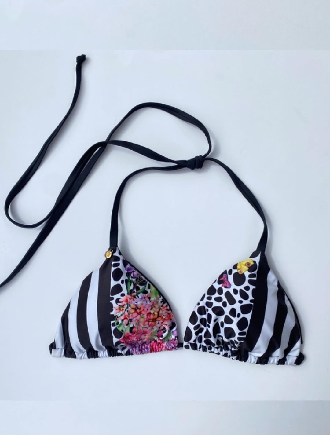 Nuestro vestido de baño de dos piezas combina un panty negro clásico, elegante y favorecedor, con un top de estampado único de la marca, diseñado para resaltar tu figura y darle un toque vibrante y distintivo a tu look. Su ajuste cómodo y su tela de alta calidad se adhieren suavemente a tu piel, brindándote soporte y libertad de movimiento en cada momento.
